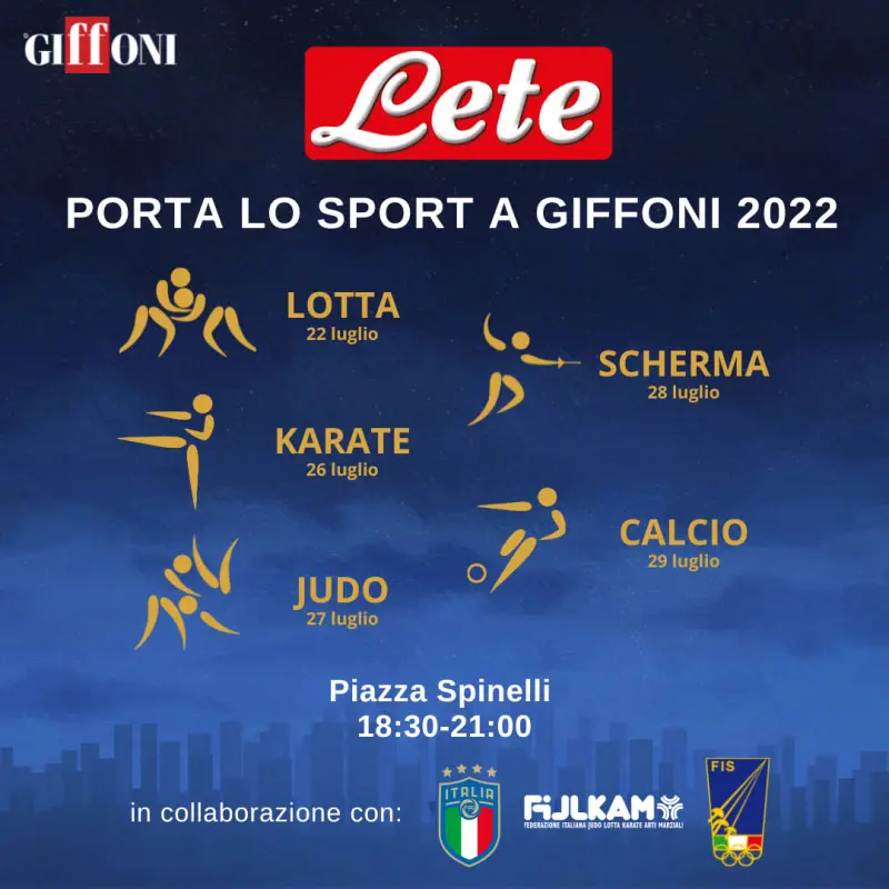 Il format “Lete porta lo Sport al Giffoni” creato da Acqua Lete in collaborazione con FIGC (Federazione Italiana Giuoco Calcio) FIS (Federazione Italiana Scherma) e FIJLKAM (Federazione Italiana Judo Lotta Karate Arti Marziali) permetterà ai giffoners, nell’arco di cinque date, di assistere ad esibizioni di atleti delle varie discipline e di avvicinarsi alle stesse con la guida di maestri federali. Il programma sarà poi arricchito dalla presenza al Giffoni della Coppa Europea vinta nel 2021 dalla Nazionale Italiana di Calcio e dall’intervento di un Campione del Mondo 1982 che, a quarant’anno dalla storica vittoria in terra spagnola, si confronterà con i giffoners sul significato dell’essere campioni nella vita e nello sport.